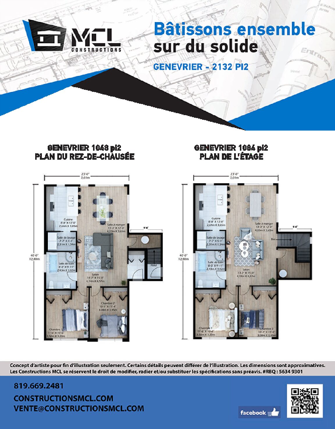 Découvrez Le Génévrier, notre tout nouveau duplex moderne qui met en valeur l’élégance de la simplicité. Ce modèle s’en distingue par son design contemporain et intelligent, offrant deux logements presque identiques de 920 pi² approximatif. Chaque unité comprend : 2 chambres à coucher, 1 salle de bain, Cuisine, salle à manger et salon spacieux ainsi qu’une salle de lavage pratique.