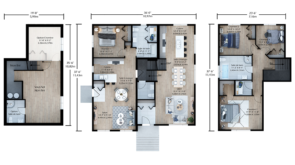 Sans oublier le logement complémentaire qui propose 1 chambre à coucher, 1 salle de bain, cuisine, salle à manger et salon sur un plancher. Ce modèle propose également un sous-sol non terminé.